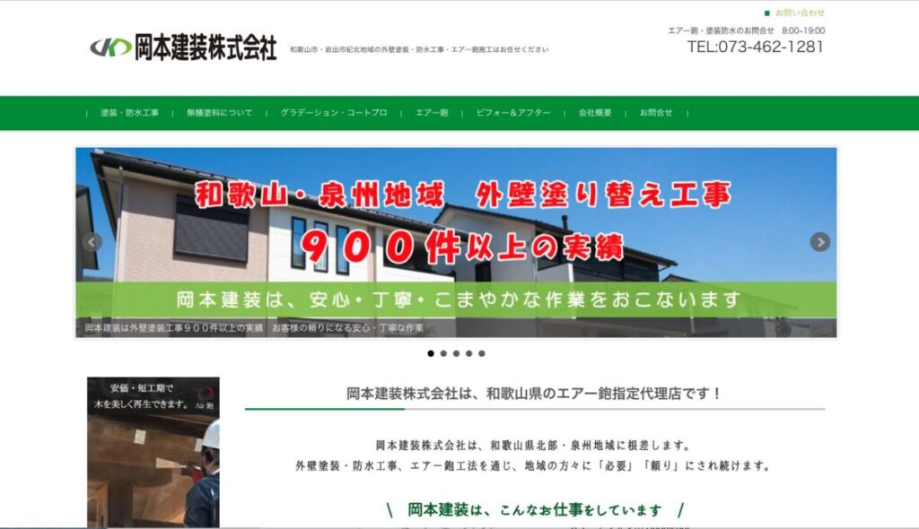 営業時間 8:00~19:00 定休日 日曜日 対応エリア 和歌山市北部地域 和歌山市・岩出市・ 紀の川市・海南市・有田市 かつらぎ町・有田川町など 大阪泉州地域 泉南市・阪南市・岬町・ 泉佐野市など 住所 〒640-8482 和歌山県和歌山市六十谷1294番地63 電話番号 073-462-1281 HP https://okamoto-kenso.com/ 和歌山市・岩出市紀北地域の外壁塗装なら岡本建装株式会社にご相談ください。