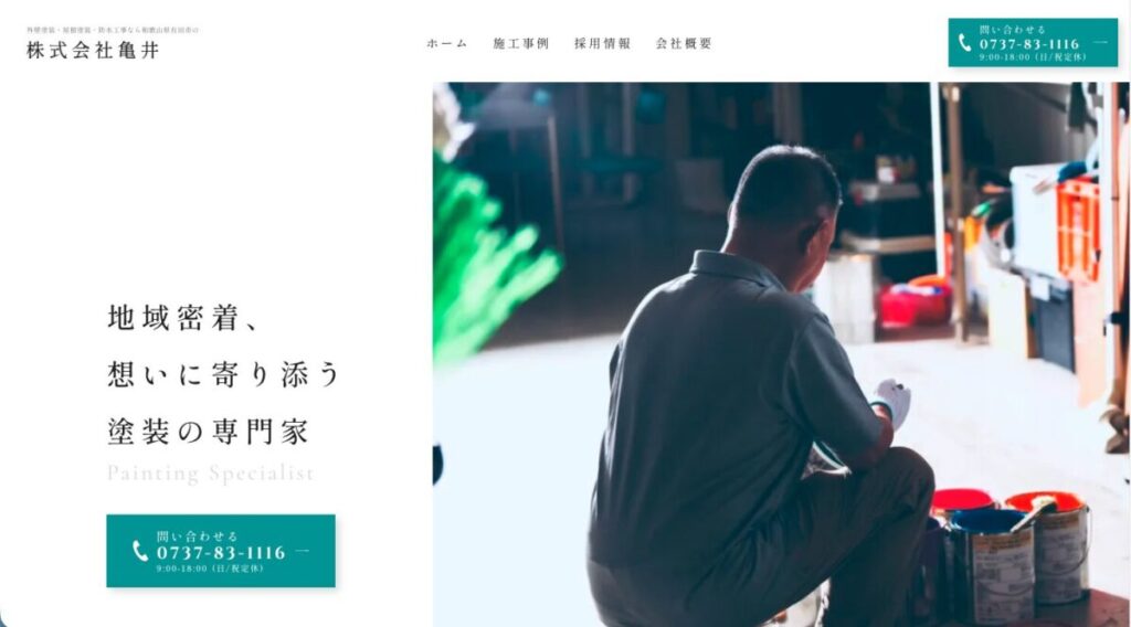 営業時間 8:30~18:30 定休日 日曜日 対応エリア 有田市、有田川町 他 住所 〒649-0314 和歌山県有田市野419-3 電話番号 0737-83-1116 HP https://kamei-kt.jp/ 1948年創業、有田市に拠点を置く歴史ある塗装店。ニコニコ親切・丁寧をモットーに活動している。外壁塗装や屋根塗装の他、室内塗装、ベランダ防水など住まいのメンテナンスを幅広く行う。現場調査の際はドローンも使用し、隅々までチェックをする。
